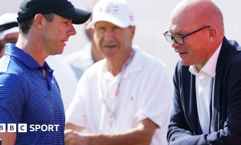 Image source, Getty ImagesDP World Tour boss Guy Kinnings (right) knows the importance of enticing Rory McIlroy to play in as many of his events as possible